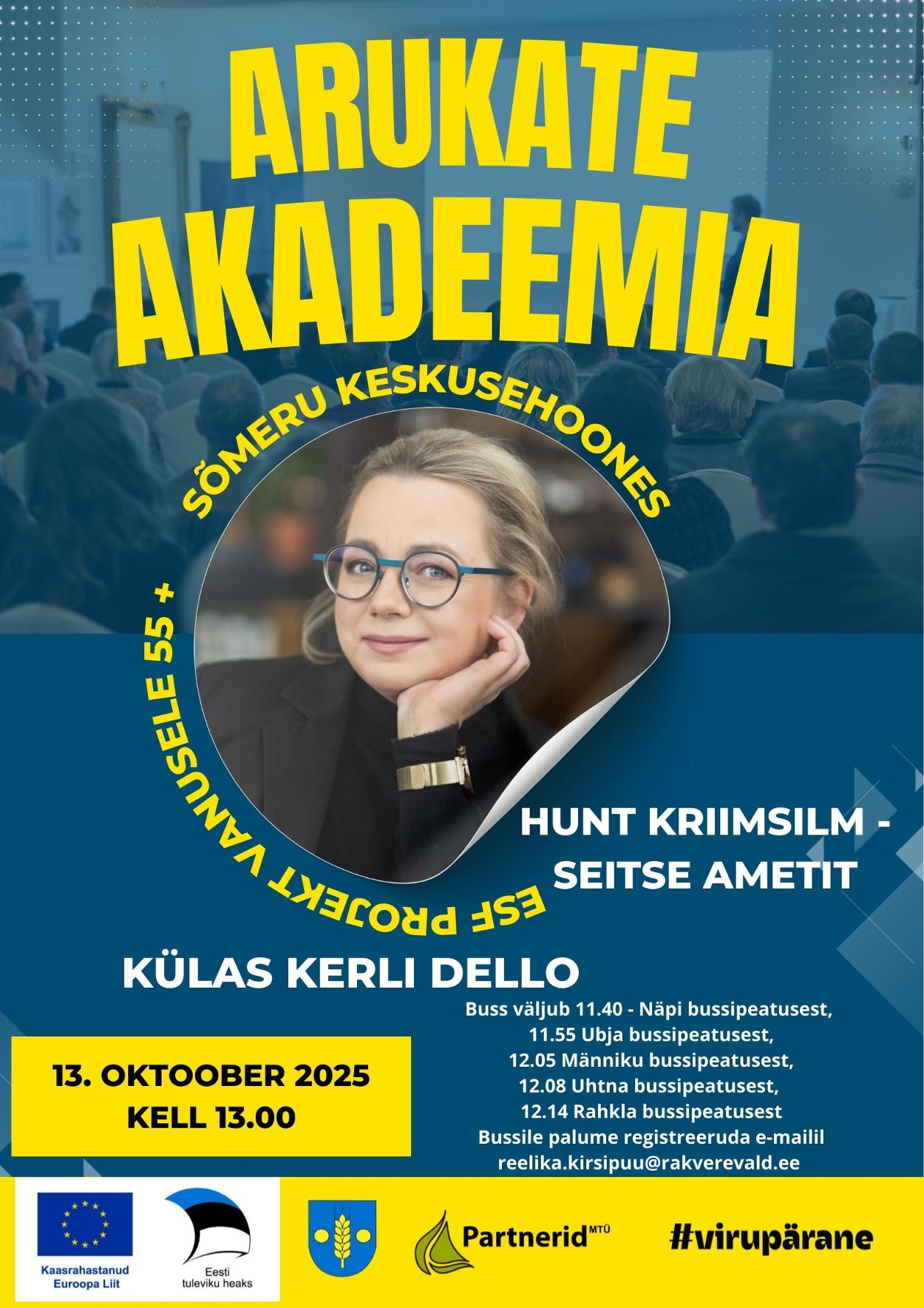 Esimesel kohtumisel 08. septembril on külalisteks Merle Tammela, kes räägib oma kogemuslugu pensionile jäämisest ja tegevustest. Sotsiaalkindlustusamet aga räägib pensioni planeerimisest ja Eesti pensionisüsteemist. Oktoobris aga on meil külas juba Kerli Dello, kellel on seitse ametit nagu Hunt Kriimsilmal. Täpsemat reklaami palun jälgi Rakvere valla kodulehel ja sotsiaalmeedia kanalites ning valla lehes.