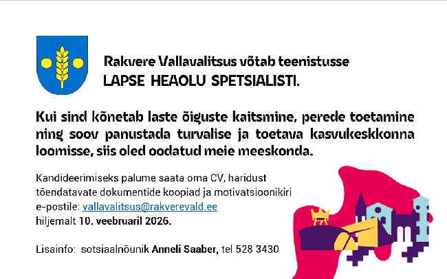 Kandideerimiseks palume saata oma CV, haridust tõendatavate dokumentide koopiad ja motivatsioonikiri e-postile: vallavalitsus@rakverevald.ee hiljemalt 10. veebruaril 2026.