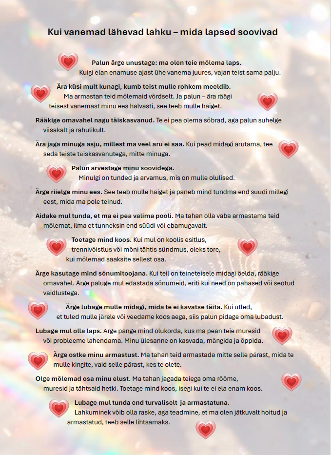 Infomaterjalidest leiavad nõu ja tuge nii vanemad, kes plaanivad ühise kooselu lõppu, mõtlevad lahutusele või taastuvad lahkuminekust kui ka nende sõbrad ning lähedased.