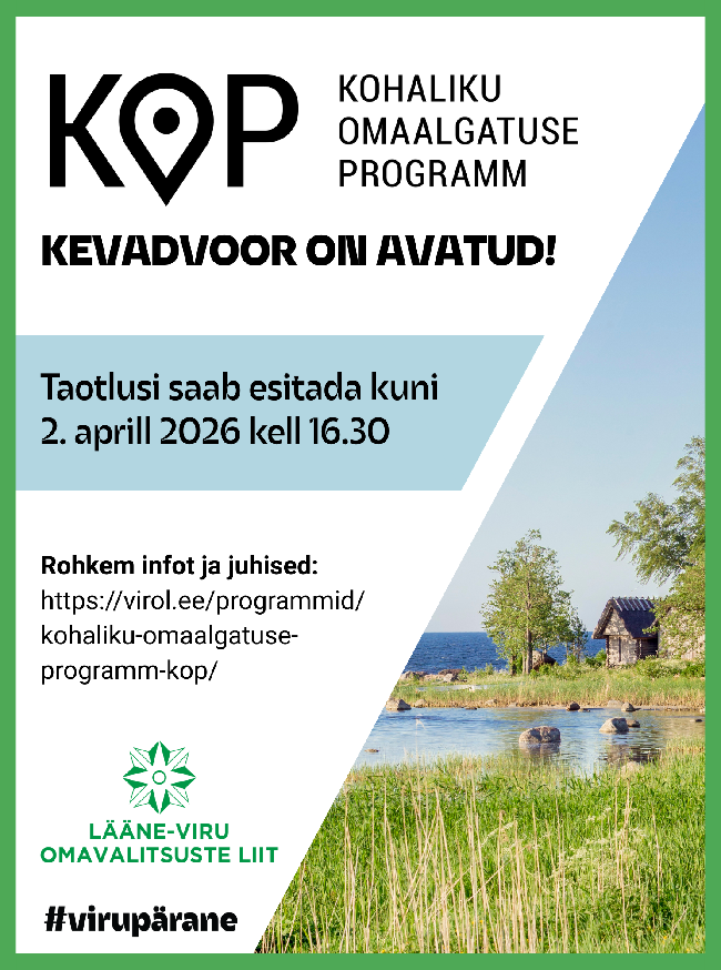 Kohaliku omaalgatuse programmi (KOP) 2026. aasta kevadvoor avanes 2. märtsil ja on avatud 2. aprillil kella 16.30-ni . Infopäevad KOP üle-eestiline infopäev toimub Zoomis...