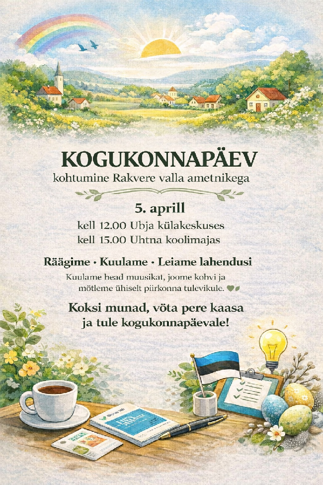 Rakvere Vallavolikogu korraline istung toimub 25. märtsil 2026. aastal, algusega kell 16:00 Sõmeru keskusehoone nõupidamiste saalis (Kooli tn 2, Sõmeru). PÄEVAKORD: 1. Volituse andmine...