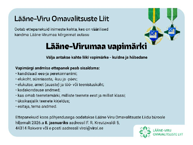 Lääne-Viru Omavalitsuste Liit (VIROL) kutsub maakonna elanikke, asutusi ja organisatsioone üles esitama kandidaate, keda autasustada Lääne-Virumaa kõrgeima tunnustuse – vapimärgiga. ...