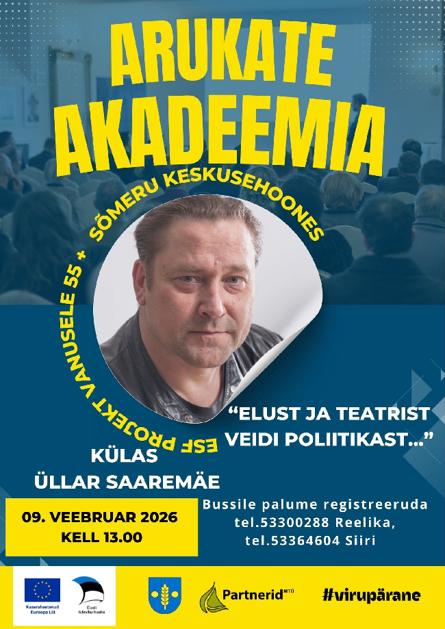 Esmaspäeval, 9. veebruaril kell 13.00 on huvilised oodatud Sõmeru keskusehoonesse, et kuulata näitleja, lavastaja ja poliitiku Üllar Saaremäe mõtteid elust, teatrist ja veidi ka poliitikast. ...