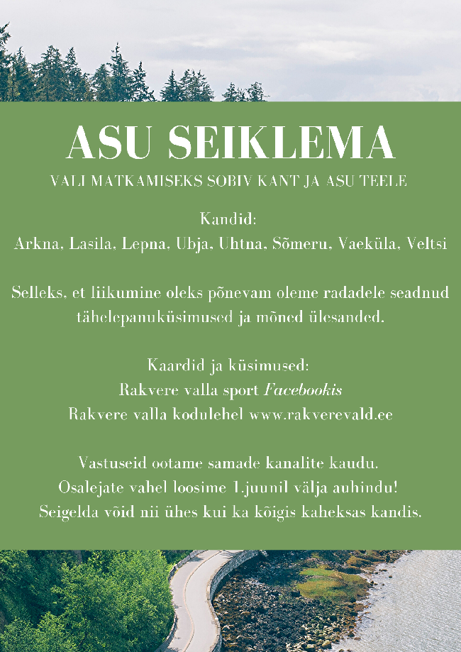 "Asu seiklema!" raames on igasse Rakvere valla kanti (Arkna, Lasila, Lepna, Uhtna, Ubja, Sõmeru, Veltsi, Vaeküla) rajatud matkarada. Selleks, et liikumine oleks põnevam oleme radadele seadnud tähelepanuküsimused ja mõned ülesanded. Kaardid ja küsimused on hetkel saadaval Rakvere valla sport facebooki lehel ja Rakvere valla koduleheküljel. Vastuseid ootame samade kanalite kaudu vastusevormidel. Kõigi osalejate vahel loosime 1.juunil välja auhindu. Seigelda võid nii ühes kui ka kõigis kaheksas kandis.