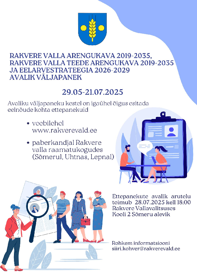 Rakvere valla arengukava 2019-2035, Rakvere valla teede arengukava 2019-2035, eelarvestrateegia 2026-2029 eelnõu on suunatud avalikule väljapanekule, mis toimub valla veebileheküljel ja paberkandjal Rakvere valla raamatukogudes (Sõmerul, Uhtnas, Lepnal) perioodil 29.05.2025-21.07.2025.