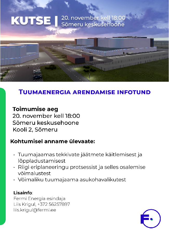 Fermi Energia ootab kõiki huvilisi tuumaenergia arendamise infotundi, mis toimub neljapäeval, 20. novembril kell 18:00 Sõmeru keskusehoones (Kooli 2, Sõmeru).